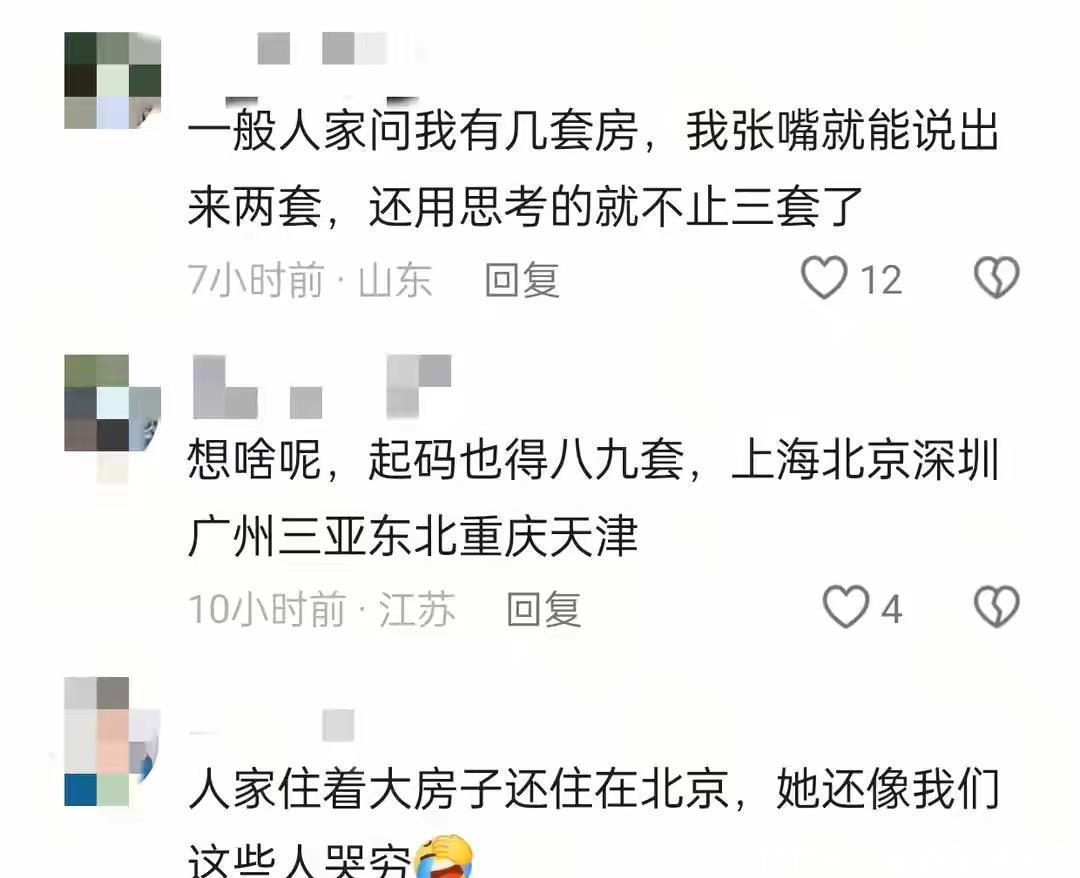 因为她本来就不穷,网友问她有几套房,她说有三套吧。要知道,在北京有三套房多值钱啊,随便一套都是上千万的。没钱没房的人都没哭穷呢,她哪门子来哭穷啊。